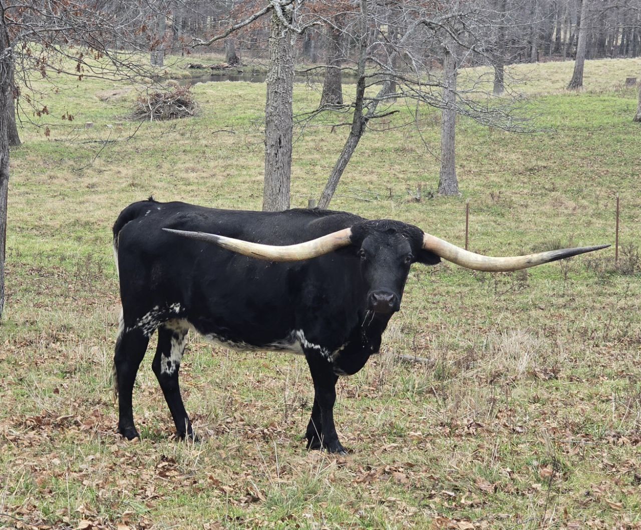 Low, tightly twisting lateral horn in a True Black cow. Very gentle disposition. She consistently produces color and flash! Confirmed bred to Tuff it Out. 84" 5 year old!