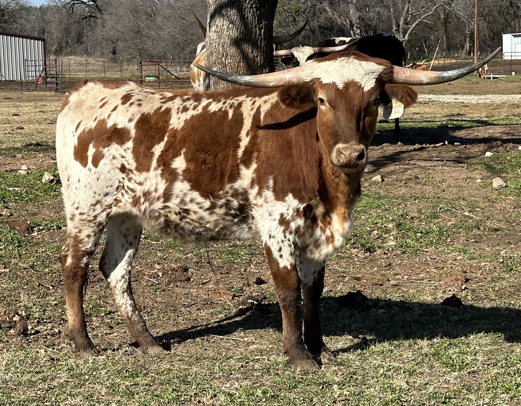 Colorful young heifer sired by Brazos Rose ranger, this bull would have been 92"TTT but broke off 6" on each tip, he's a son of the 93"TTT Jamakizm's Alphie 4/8, she's one of the best daughters of WS Jamakizm out there and half sister to the 90"TTT Drag Iron. Double bred Jamakizm's Alphie 4/8, and names like 105"TTT Cowboy Tuff Chex, 100"TT BL Rio Catchit, and Field of Pearls in her pedigree for lots of potential horn growth. She is built correctly, colorful, calm disposition, and early promising horn