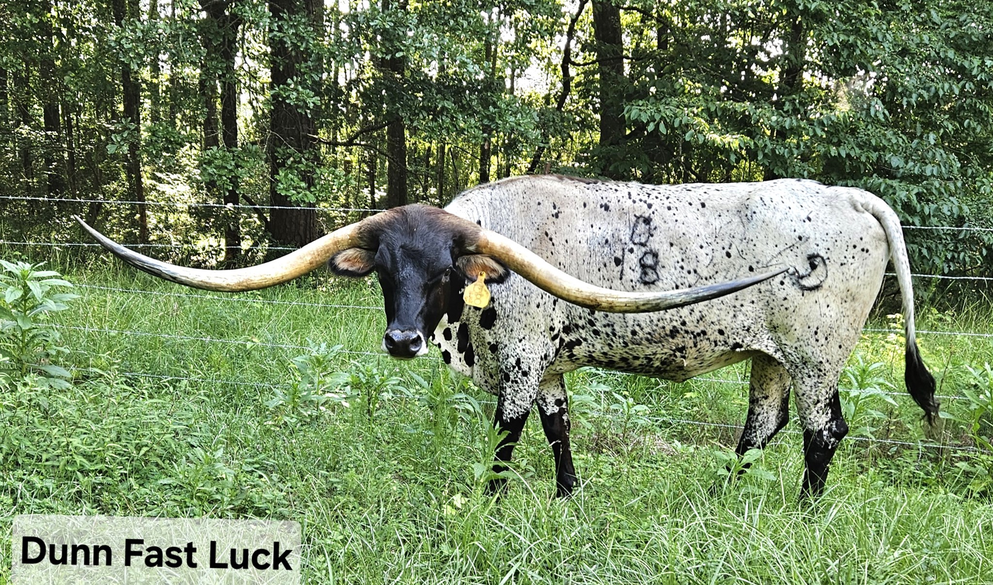 Beautiful blue speckled daughter of Dunn Got Double Lucky (Jr). He was 99.75" ttt at last measurement and she is working on her own awesome measurement, all while wearing her brood cow hat!!