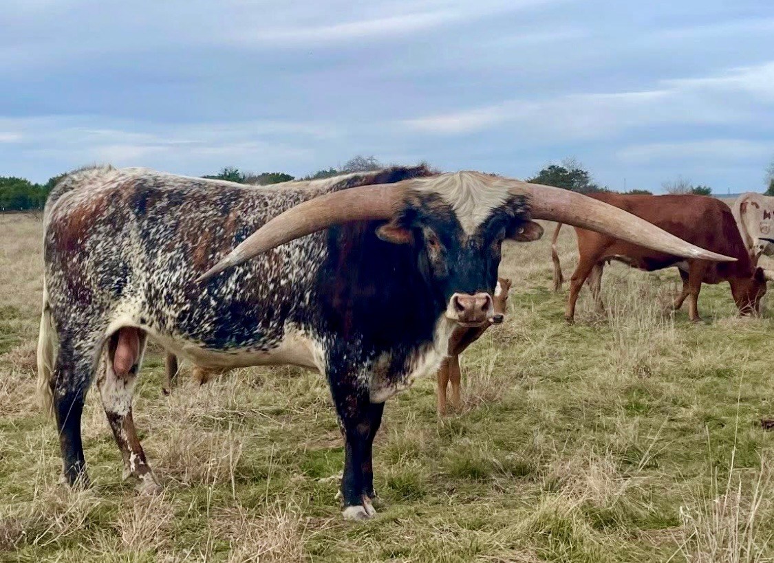 Unbelievable what this young 2 yr old is turning into. Love that his sire is Cactus Jack with what hes putting on the ground as well as his bottom side with Gold Mine. Love his mother PCC Golden Palace and grandmother Titans Pepper EOT. He was a double bronze winner in 2025 winning his class in total horn and composition missing the TTT by less than half of an inch...measuring over 77" a few days before turning 27 months old. Over 92" of total horn at that time. An awesome color with an incredible leather coat and his body is getting bigger than I thought he would be. He has accomplished all of this while being turned out on heifers at 12 months to start breeding. He loves head scratches but since he is a little stubborn it makes a little difficult to work in the pens. He likes to back up when you're trying to push him. All of his calves are looking super with great thickness and we're looking forward to his great looking future.