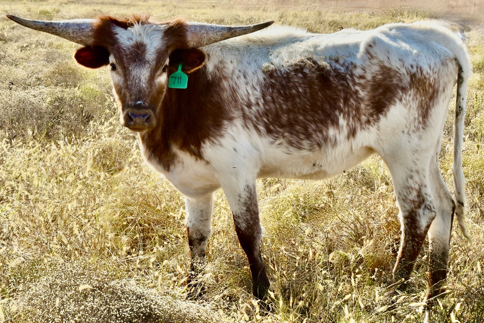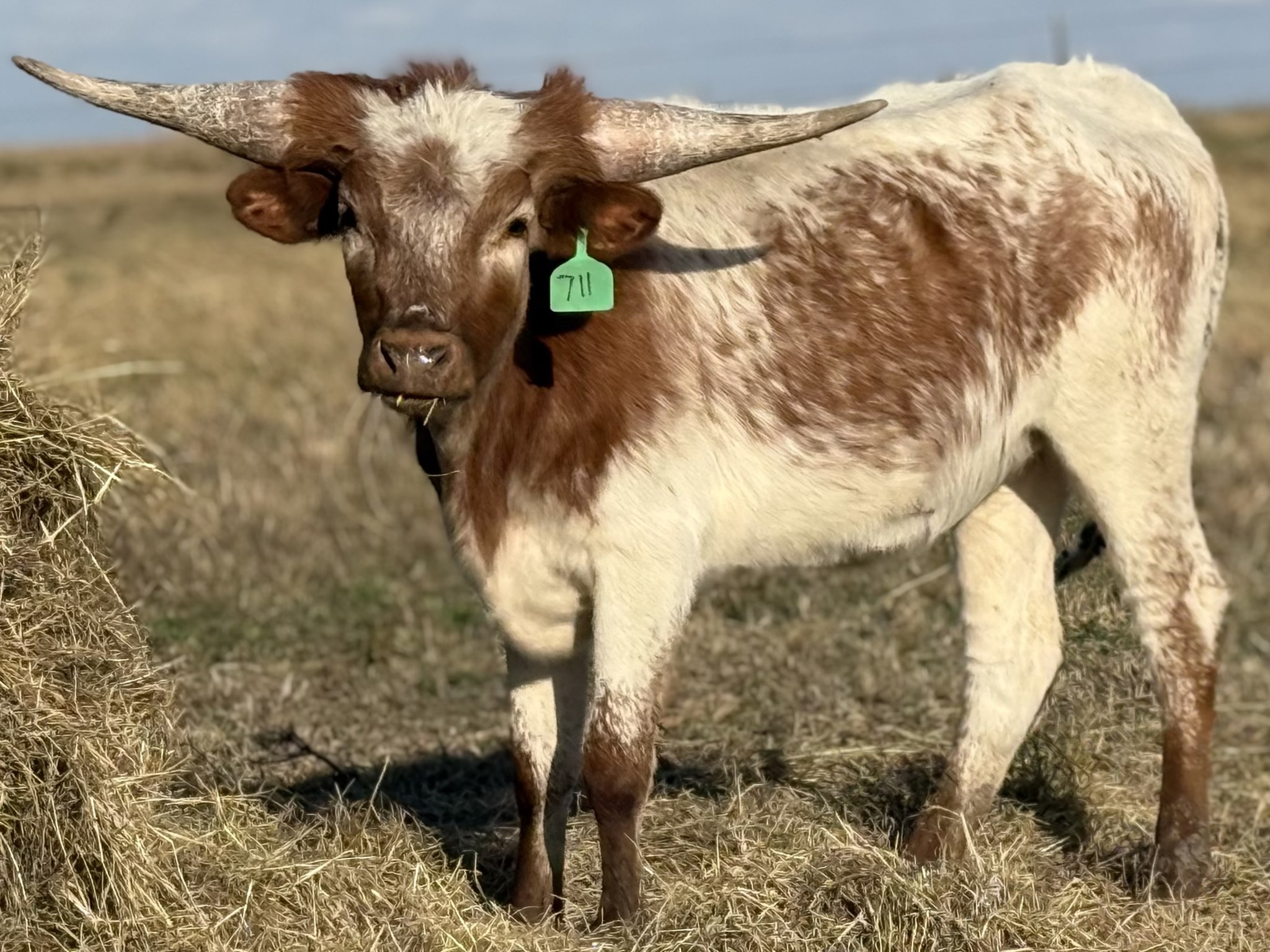 PCC Cactus Jack is the sire to this female. He has won multiple honors including the highly competitive 2023 Legends Grand Champion Bull and the 2023 and 2024 TLBAA Horn Show Case Ultimate bull. He is docile with a great disposition.He was 86’’ TTT on his 3rd birthday and now in his 90's'' TTT in his 4th year. Most importantly, his offspring are the complete package --large framed with great lateral horn direction and very striking color— something which equates to value in this industry.Having Cowboy Tuff Chex and JP Rio Grande in the pedigree only enhances offspring potential. ( Pace/Gilliland/Manning/Loomis)